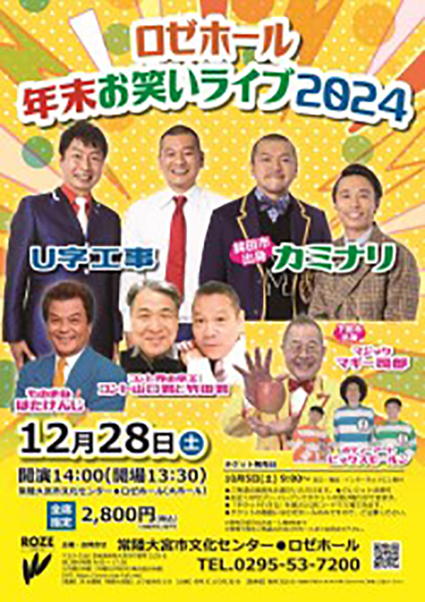 ロゼホール 年末お笑いライブ2024催し物一覧に戻る 終了 「ごめんね、ごめんね~」でおなじみの U字工事 茨城弁のネタでおなじみの カミナリ 北関東芸人と言えばこの2組ですよね!? 「お客様は神様です」でおなじみの はたけんじ コント界の帝王 コント山口君と竹田君 下館市出身の優しい茨城弁マジック マギー司郎 ダイナミックなボディーアートで人気の ビックスモールン 豪華6組の爆笑ネタをお届けします! ぜひ2024年の笑い納めはロゼホールで!! イベント詳細公演日2024年12月28日(土)開演時間開演14:00(開場13:30) 主催常陸大宮市文化センターチケット販売購入方法の詳細はこちらのページをご覧ください。チケット予約購入のご案内■2024年10月5日(土)9:00から窓口・電話・インターネットにて販売開始。発売初日のみお一人様4枚までのご購入となります。■電話・インターネット予約では、セブン-イレブンでの受け取りが可能です。■ネット予約では電子チケットサービス『チケットれすQ』を選択できます。 (お支払いは、クレジットカード決済のみとなります。)電子チケットサービス(チケットれすQ)についての詳細はこちらこちらをご覧下さい。■車いす席をご希望のお客様は、ロゼホールまでご予約下さい。チケットれすQhttps://www.e-get.jp/howto/resq/resq.html席種・料金(税込)《全席指定》2,800円※未就学児入場不可出演U字工事カミナリはたけんじコント山口君と竹田君マギー司郎ビックスモールンお問い合わせ常陸大宮市文化センター●ロゼホールTEL:0295-53-7200※出演者の都合により、演目・日時等が変更になることがあります。※電話予約は、常陸大宮市文化センターのみとなります。※電話予約の際、座席指定ができない場合がございます。※窓口でチケットが完売した場合は電話予約はお受けできませんので、ご了承下さい。※プレイガイドごとに、販売開始時間が異なります。※アクセスについて。常磐自動車道那珂ICから30~40分です(交通事情によります)。無料駐車場が350台ありますが、混み合う事が予想されますので、乗り合いでご来場いただけますようご協力をお願い致します。
