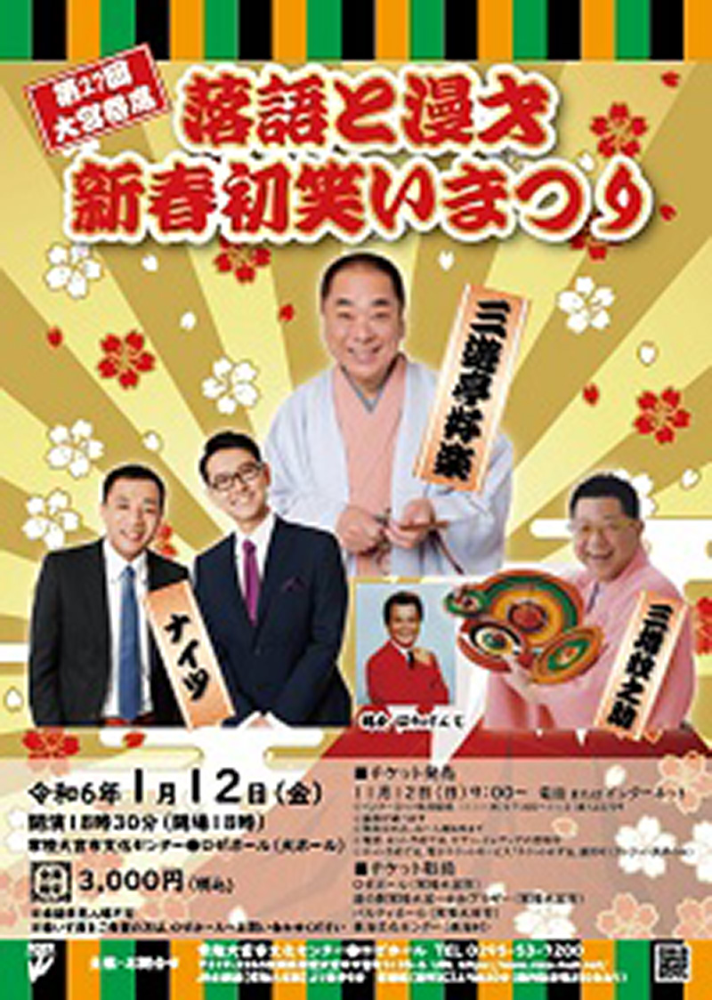 第27回大宮寄席~落語と漫才 新春初笑いまつり催し物一覧に戻る 終了 27回目となりました大宮寄席 落語 / 三遊亭好楽師匠 漫才 / ナイツ 独楽回し / 三増紋之助 司会 / はたけんじ 2024年の初笑いはロゼホールで! イベント詳細公演日2024年1月12日(金)主催常陸大宮市文化センター開演時間開演18:30(開場18:00)チケット販売購入方法の詳細はこちらのページをご覧ください。チケット予約購入のご案内発売初日のみお一人様4枚までのご購入となります。■2023年11月12日(日)9:00から電話予約・インターネットにて販売開始。■インターネット先行販売は2023年11月1日(水)17:00~3日(金)23:59■《プレイガイド》 ○ 常陸大宮市 ・ロゼホール ・道の駅常陸大宮~かわプラザ~ ○ 常陸太田市 ・パルティホール ○ 東海村 ・東海文化センター■電話・インターネット予約では、セブン-イレブンでの受け取りが可能です。■ネット予約では電子チケットサービス『チケットれすQ』を選択できます。 (お支払いは、クレジットカード決済のみとなります。) 電子チケットサービス(チケットれすQ)についての詳細はこちらをご覧下さい。■車いす席をご希望のお客様は、ロゼホールまでご予約下さい。チケットれすQhttps://www.e-get.jp/howto/resq/resq.html席種《全席指定》料金(税込み)3,000円※未就学児入場不可出演三遊亭好楽・ナイツ・三増紋之助司会はたけんじお問い合わせ常陸大宮市文化センター●ロゼホールTEL:0295-53-7200※出演者の都合により、演目・日時等が変更になることがあります。※電話予約は、常陸大宮市文化センターのみとなります。※新型コロナウィルス感染症により、予定が変更になる場合がありますので、ご了承ください。※ご購入いただいたチケットの払い戻しはできませんのでご注意ください。公演が中止または延期になった場合のみ、チケットの払い戻しを致します。※プレイガイドごとに、販売開始時間が異なります。※アクセスについて。常磐自動車道那珂ICから30~40分です(交通事情によります)。無料駐車場が350台ありますが、混み合う事が予想され停められない場合もありますので、なるべく乗り合いでご来場いただけますようお願い致します。